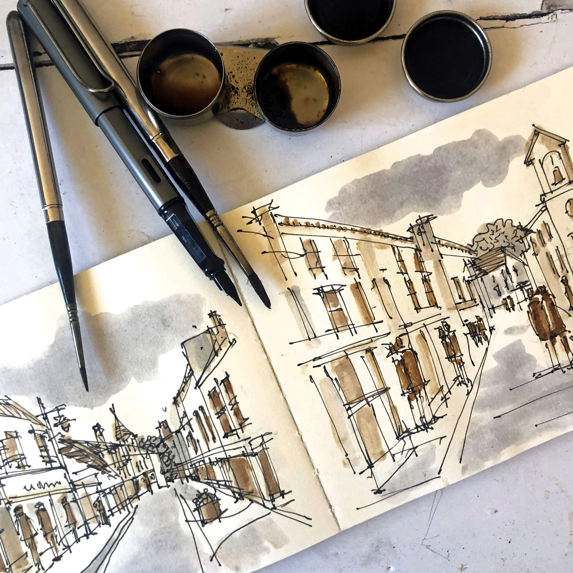 I sketch urban perspective in line and wash watercolour. Sketching mostly in South Devon, England and also other places that I visit.