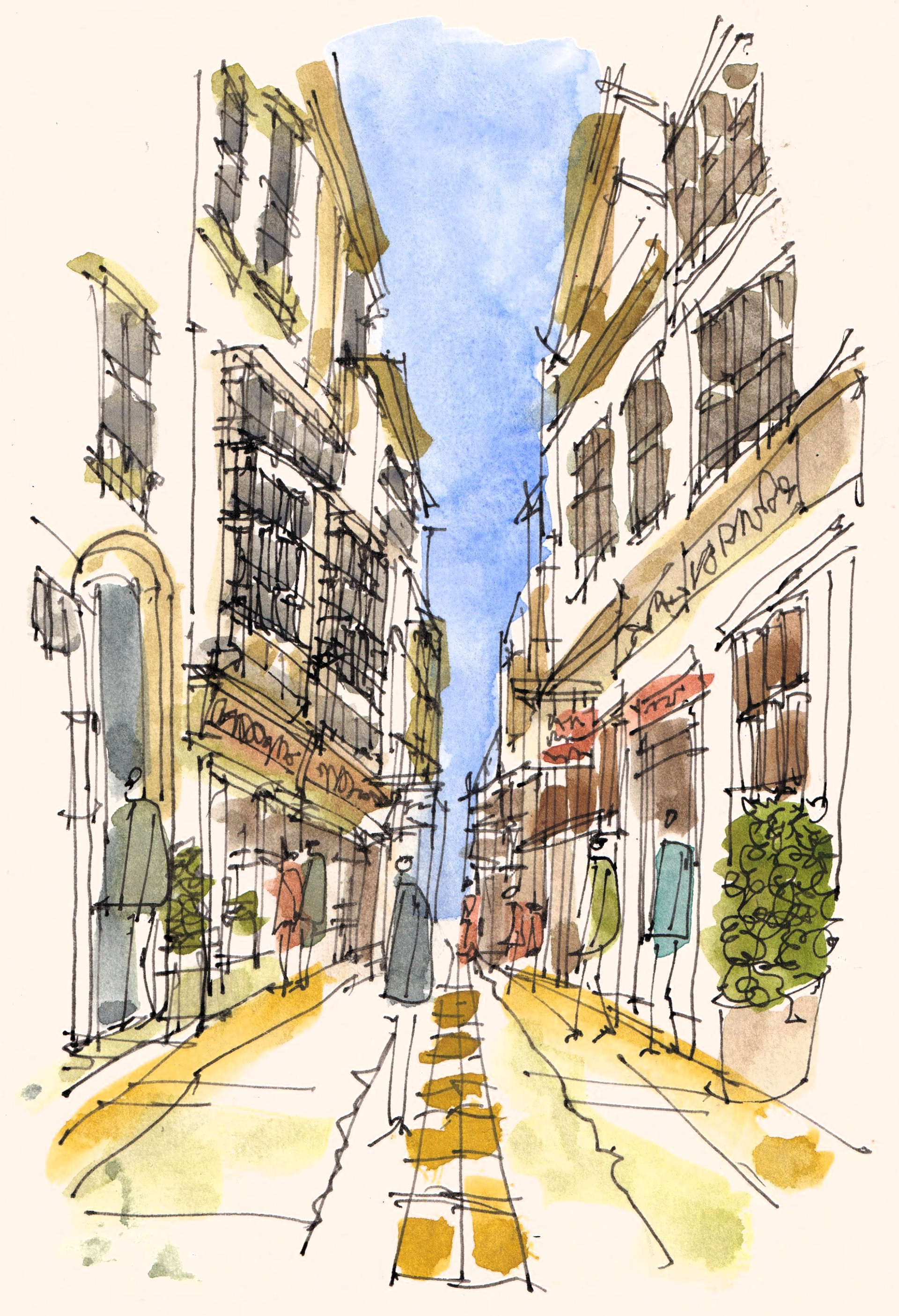 I sketch urban perspective in line and wash watercolour. Sketching mostly in South Devon, England and also other places that I visit.