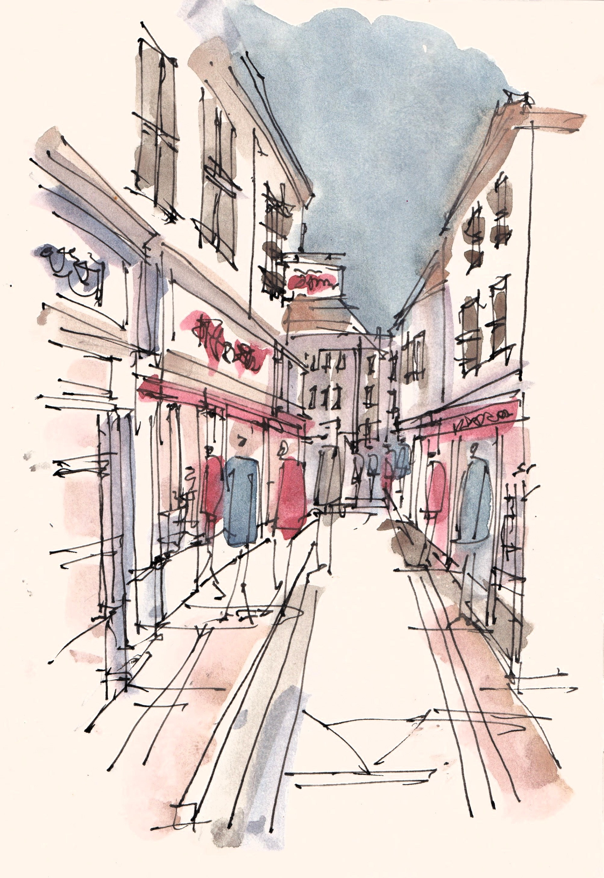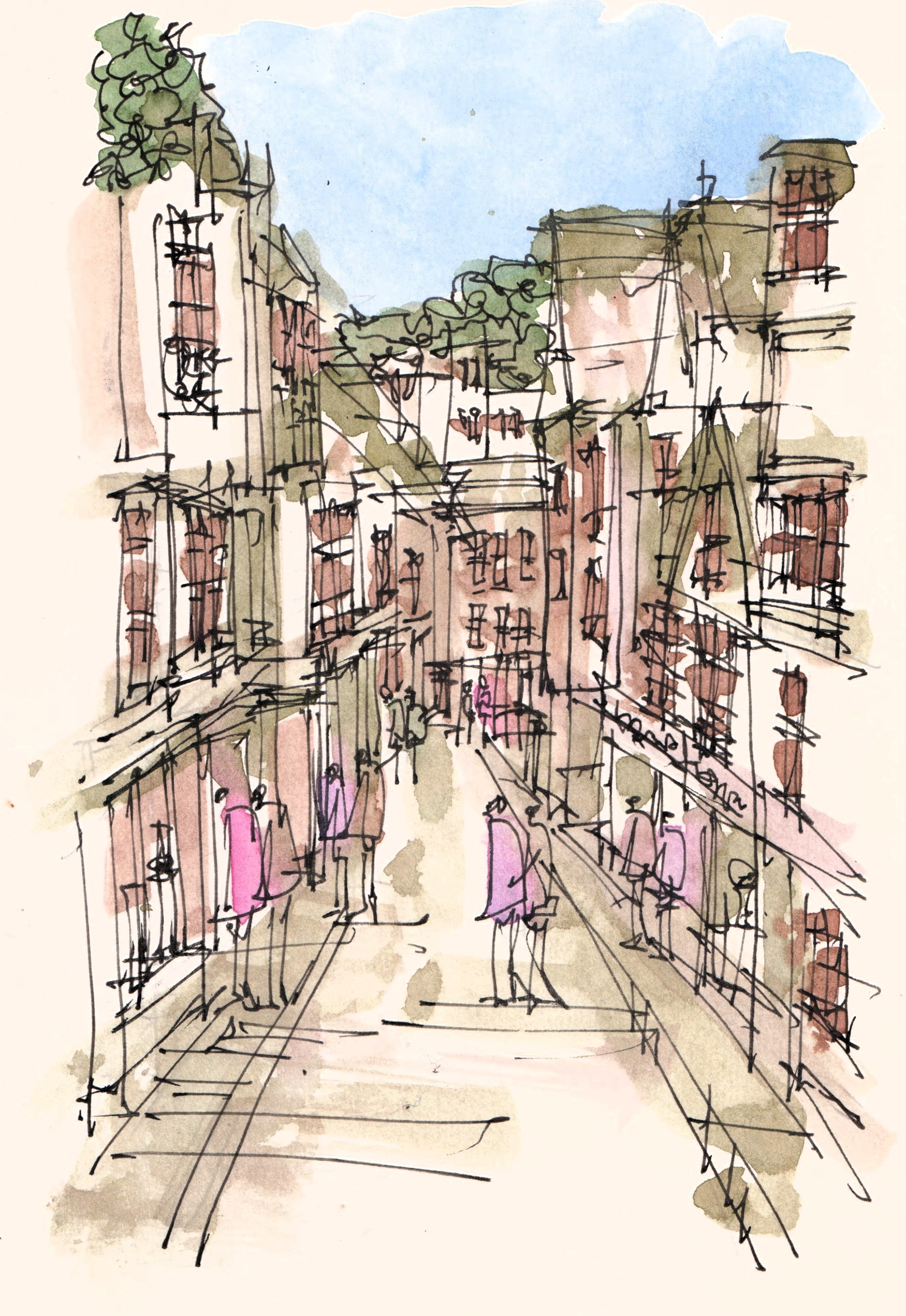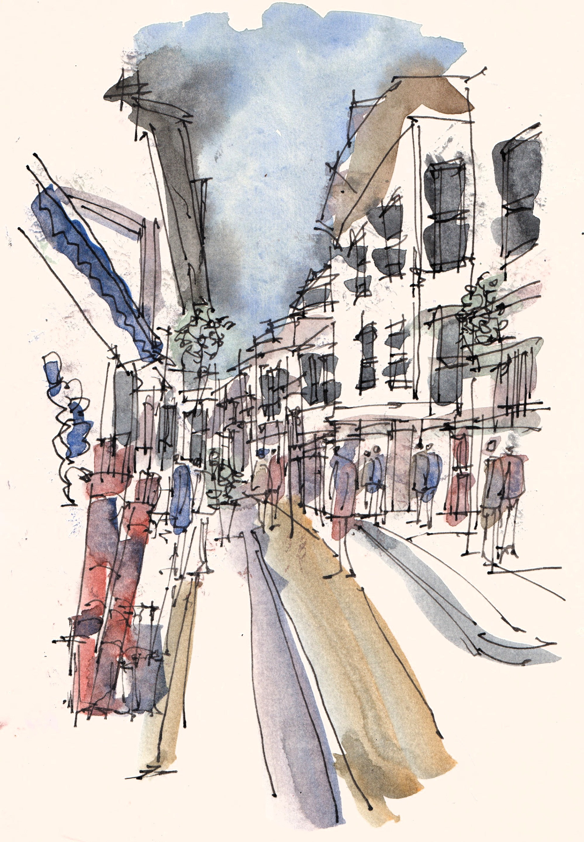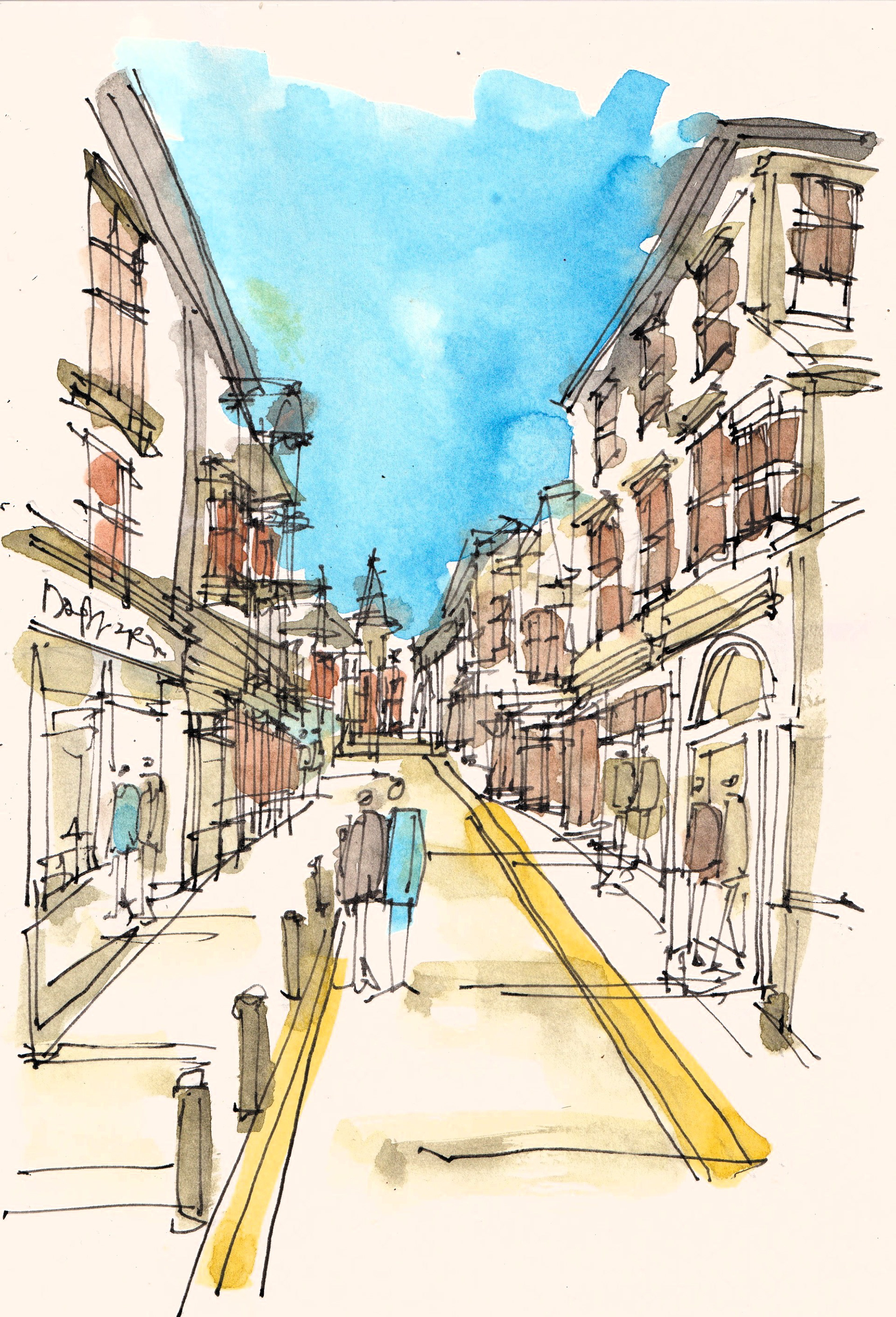 I sketch urban perspective in line and wash watercolour. Sketching mostly in South Devon, England and also other places that I visit.
